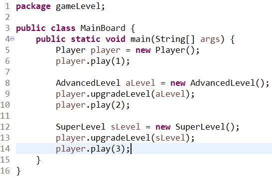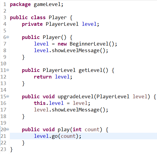 Player 클래스는 한 번에 하나의 레벨 상태이므로 level 변수에 레벨에 해당하는 인스턴스를 대입한다. 레벨을 변경할 수 있는 upgradeLevel( )도 만든다. 6행 Player 디폴트 생성자에서 초기 레벨을 Beginner로 지정하고 현재 레벨이 무엇인지 출력한다. 15행 upgradeLevel( )메서드는 모든 레벨이 매개변수로 대입될 수 있기에, 모든 레벨의 상위 클래스인 Player Level을 매개변수의 자료형으로 정했다. 20행의 Play( ) 메서드에서는 PlayerLevel 클래스가 제공하는 go( )메서드를 호출한다.