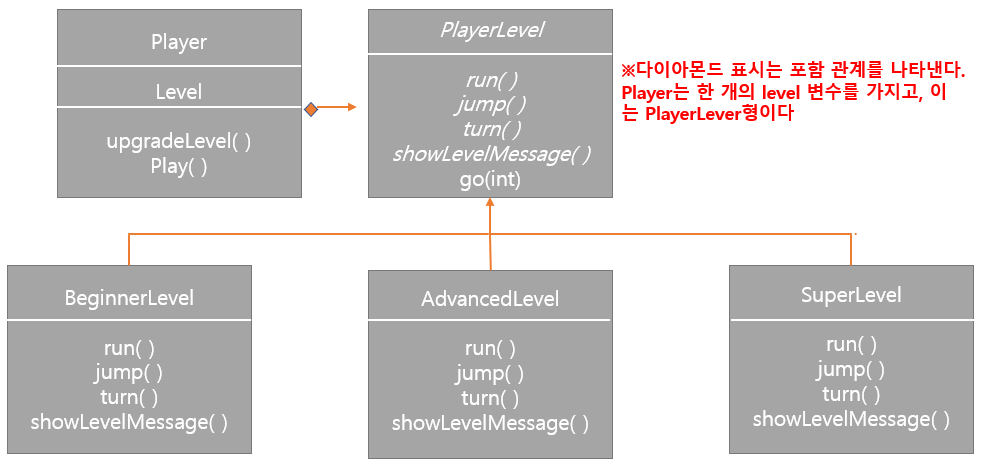 Player 클래스와 PlayerLevel 클래스는 포함(HSA-A) 관계이다. 게임에서 모든 Player는 자신의 레벨을 갖기에, Player 클래스에서 PlayerLevel을 멤버 변수로 갖는다. 레벨이 올라갈수록 수행할 수 있는 기능이 달라지므로 PlayerLevel 클래스를 추상 클래스로 만들어 모든 레벨에서 공통으로 수행하는 기능을 구현하고, 각 레벨마다 달라지는 기능은 추상 메서드로 만들어 둔다. 그리고 PlayerLevel을 상속받은 하위 클래스에서 추상 메서드로 선언한 부분을 나름의 필요에 맞게 구체적으로 구현하면 된다.