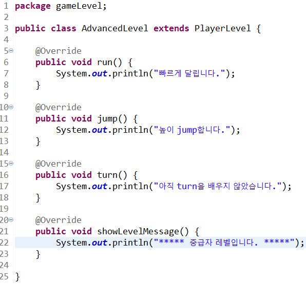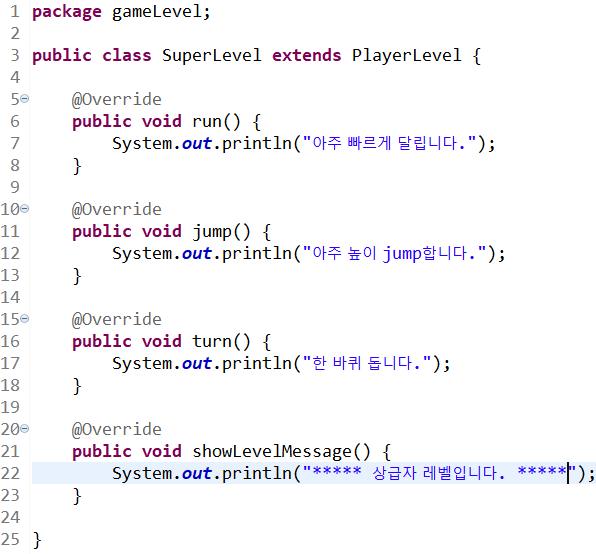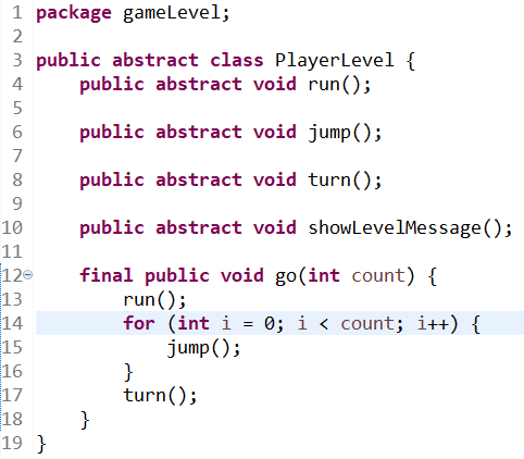 각 레벨에서 수행할 공통 기능은 PlayerLevel 추상 클래스에서 선언한다. 각 레벨마다 다르게 구현되어야 하는 메서드는 추상 메서드로 선언한다. go( ) 메서드는 시나리오대로 수행되어야 하므로 코드 내용을 완전히 구현했다. 이 코드는 모든 레벨에서 동일하고 불변해야하기에 final 예약어를 사용해 템플릿 메서드로 구현했다. 각 레벨에서는 해당 레벨별로 제공하는 메서드들의 기능을 구현한다.