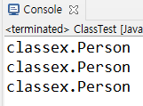 12행의 forName( ) 메서드를 살펴보면 클래스 이름(패키지 이름 포함)으로 가져오는 경우에는 매개변수로 쓰이는 값이 문자열이다. 이때 매개변수로 받은 문자열에 해당하는 클래스가 존재하지 않으면 클래스를 가져오는 데 실패한다. 이때 ClassNotFoundException이 발생한다. 6, 9, 12행에서 Class를 가져온 후 getName( ) 메서드를 호출하면 클래스 이름인 classex.Person이 출력되는 것을 볼 수 있다. 즉 Class 클래스를 통하여 클래스 정보를 알 수 있다.