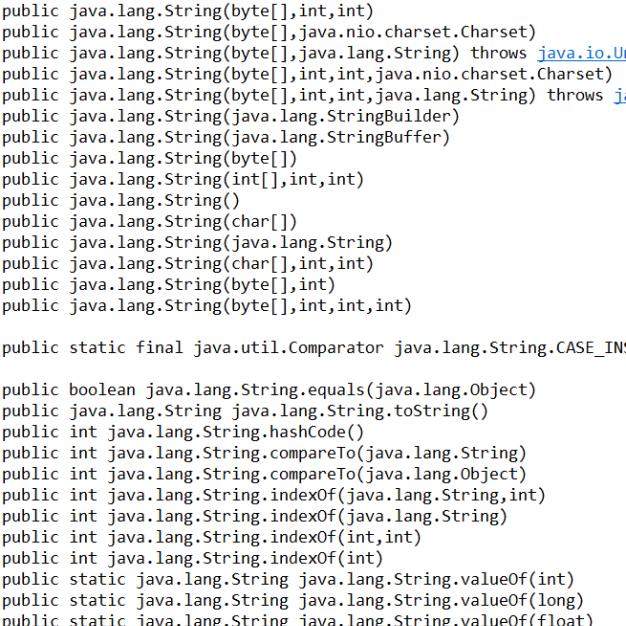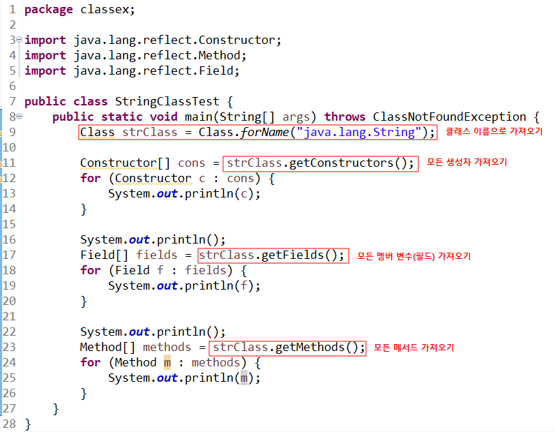 Class 클래스의 몇 가지 메서드를 활용하는 예제를 통해 정보를 어떻게 찾는지 알아보자. 아래 예제에서 사용하는 Constructor, Method, Field 등의 클래스는 java.lang.reflect 패키지에 정의되어 있다. Class 클래스와 java.lang.reflect 패키지의 클래스를 사용하면 리플렉션 프로그래밍을 할 수 있다. 아래 예제에서 String 클래스 정보를 가져오는 방법을 살펴보자.
