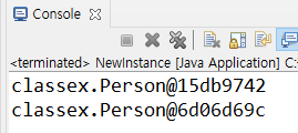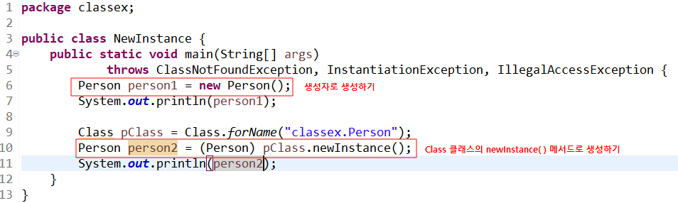 지금까지 Class 클래스를 사용해 클래스의 정보만을 확인했다. 그럼 이 정보를 바탕으로 인스턴스도 생성할 수 있을까? Class 클래스의 메서드 중 newInstance( ) 메서드를 사용하면 된다. newInstance( ) 메서드는 항상 Object형을 반환하므로 생성된 객체형으로 형 변환해야 한다. 앞에서 만든 Person 클래스의 인스턴스를 Class 클래스와 newInstance( ) 메서드를 사용해 생성해보자.