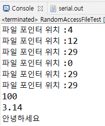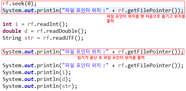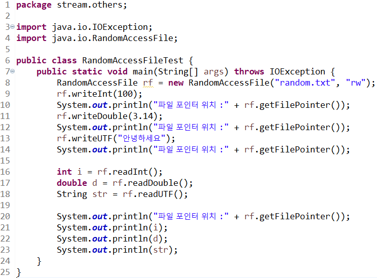 RandomAccessFile을 활용해 여러 자료형 값을 읽고 쓰는 코드를 보자.