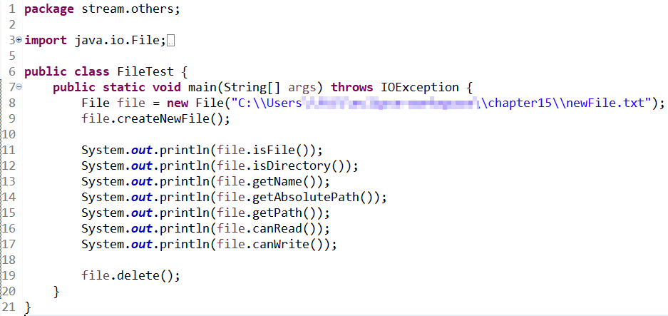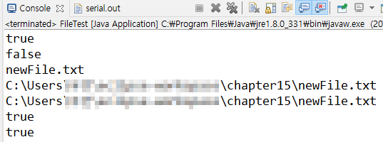 File 클래스를 생성한다해서 실제 파일이 생성되는 것이 아니라 createNewFile( ) 메서드를 활용해 파일을 생성한다. 그리고 File 클래스가 제공하는 메서드로 생성한 파일의 속성을 살펴볼 수 있다. 19행 delete( ) 메서드를 사용해 파일을 삭제한다. 이렇게 생성한 파일은 FileInputStream과 같은 파일 입출력 기능을 제공하는 클래스의 생성자 매개변수로 사용할 수 있다.