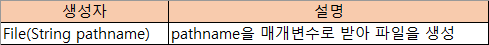 File 클래스는 파일이라는 개념을 추상화한 클래스다. 파일에 대한 입출력은 최근 글들에서 배운 스트림을 사용해 수행한다. 따라서 File 클래스에 별도의 입출력 기능은 없지만 파일 자체의 경로나 정보를 알 수 있고 파일을 생성할 수도 있다. File 클래스의 주요 생성자는 아래와 같다.