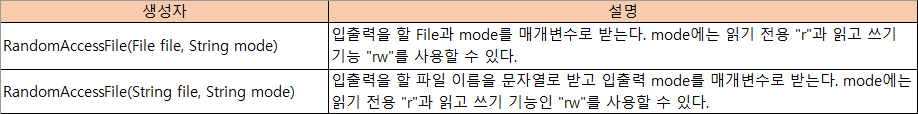 RandomAccessFile은 입출력 클래스 중 유일하게 파일 입출력을 동시에 할 수 있는 클래스다. 지금까지 배운 스트림은 처음부터 차례로 자료를 읽었지만 RandomAccessFile은 임의의 위치로 이동해 자료를 읽을 수 있다. RandomAccessFile에는 파일 포인터가 있는데, 현재 파일의 어느 위치에서 읽고 쓰는지 그 위치를 가리키는 속성이다. 스트림을 생성하지 않고 간단하게 파일에 자료를 쓰거나 읽을 때 사용하면 유용하다. 파일 포인터가 이동하는 위치가 파일 자료를 읽거나 쓰이는 위치이므로 파일 포인터의 위치를 잘 생각하며 구현해야 한다. RandomAccessFile의 생성자는 아래와 같다.